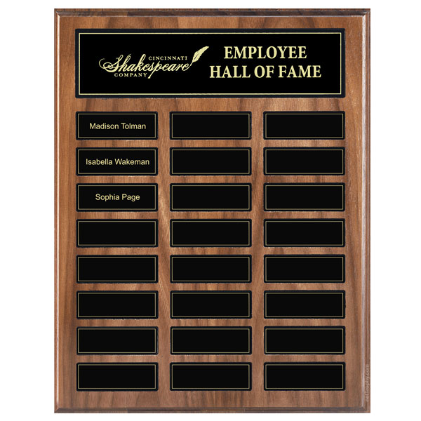 These walnut pocket perpetual plaques are a new and inventive way to create a handsome professional award. Engraved plates may be quickly changed or updated as required using a magnetic release feature that allows you to use your finger to push out the old and replace it with the new one.