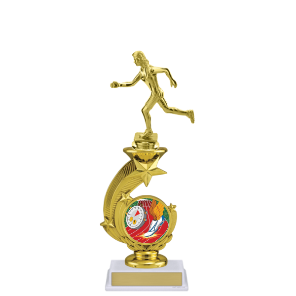 Stylish figure on accented star theme riser & trophy base with mylar.