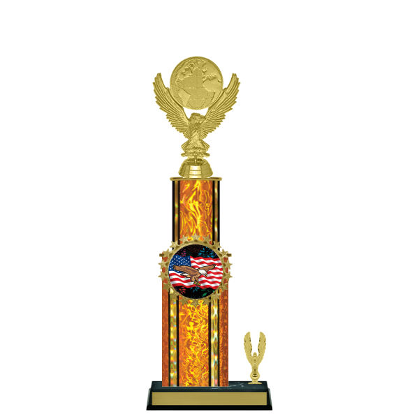Stylish figure on two tier column structure & trophy base with mylar and trim.