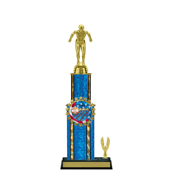 Stylish figure on two tier column structure & trophy base with mylar and trim.