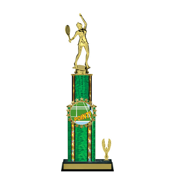 Stylish figure on two tier column structure & trophy base with mylar and trim.