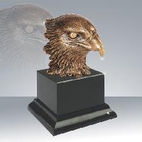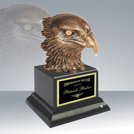 Intricately designed resin eagle head with fine gold finish. Features a genuine black marble base with black brass plate for personal engraving.