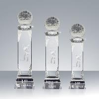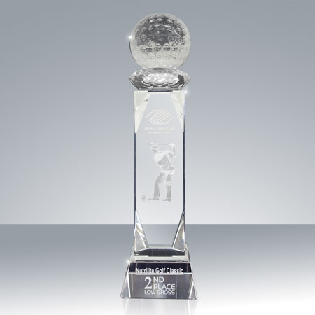 Beautiful crystal column with diamond and golfball top. Features a 3D rendering of a golfer on midsection of trophy.