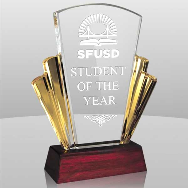 Elegant Acrylic Aspire Award with gold accents and rosewood base.