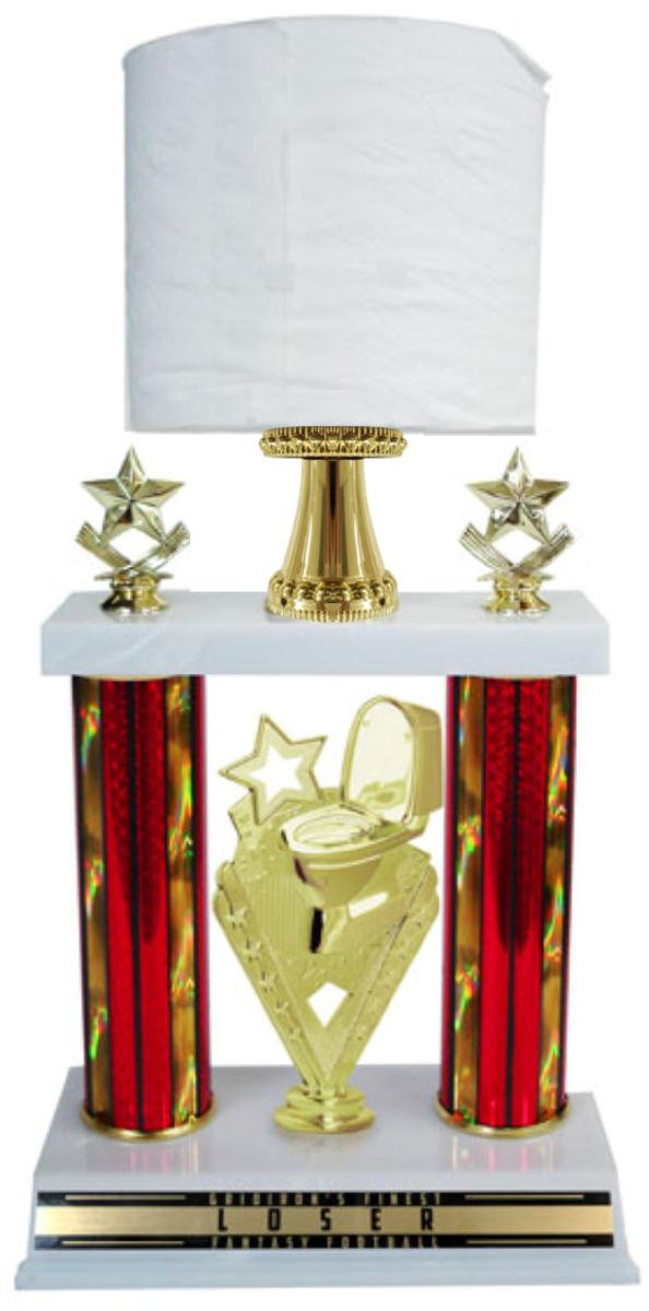 Specifically designed for that last place loser in your league! This gag features a real toilet paper roll, mounted on top of a two tier trophy, increasing the fun at your fantasy football draft or fantasy football championship party!
