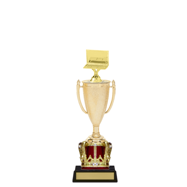 This elegant Crown Trophy features a loving cup, selectable figure and crown with red accent.