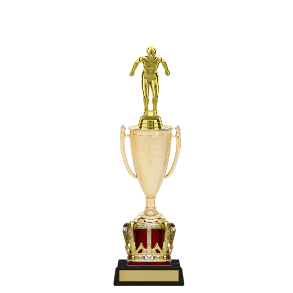 This elegant Crown Trophy features a loving cup, selectable figure and crown with red accent.