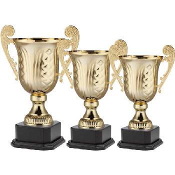 This Trophy Cup features a textured full metal cup mounted on a wood base.
