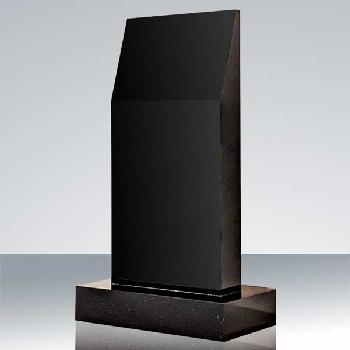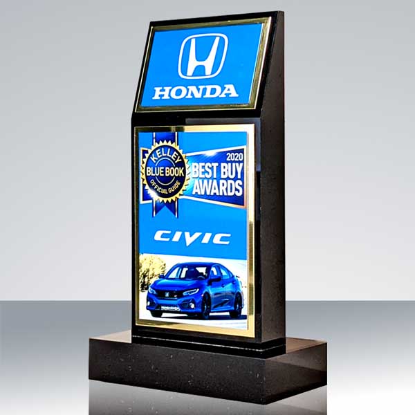 Classy black acrylic kiosk-shape trophy with two full color customizable plates attached onto the top and bottom.