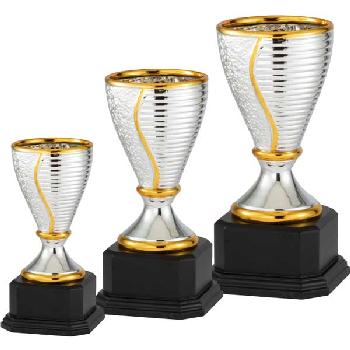 This Trophy Cup features a stylish gold and silver ceramic cup mounted on a wood base.