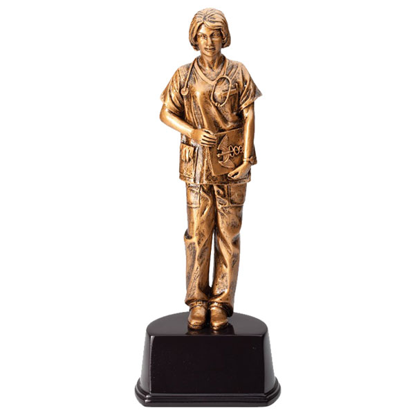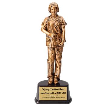 Intricately designed resin sculpture with gold tone finish. Features a black base and inscription plate for personal engraving.