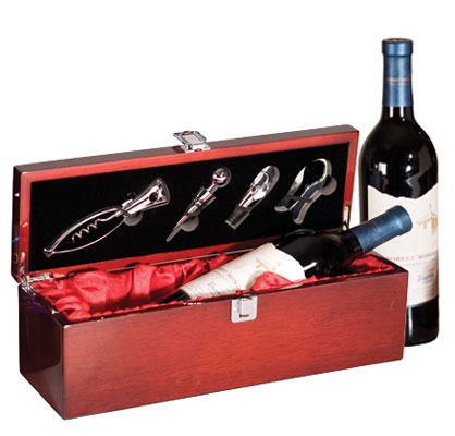 This beautiful Rosewood Piano Finish Wine Box Holds a bottle of your favorite wine and comes with a matching set of tools.  Inscription plate on the lid allows you to add your sentiment.