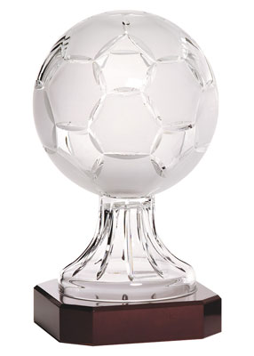 Beautiful 24% Leaded Crystal Soccerball Award with Rosewood Base.
