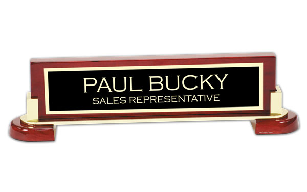 Pianowood finish with gold metal accent makes this nameplate a professional piece for the home or office.
