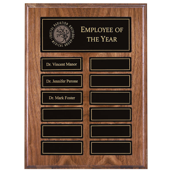 These walnut pocket perpetual plaques are a new and inventive way to create a handsome professional award. Engraved plates may be quickly changed or updated as required using a magnetic release feature that allows you to use your finger to push out the old and replace it with the new one.