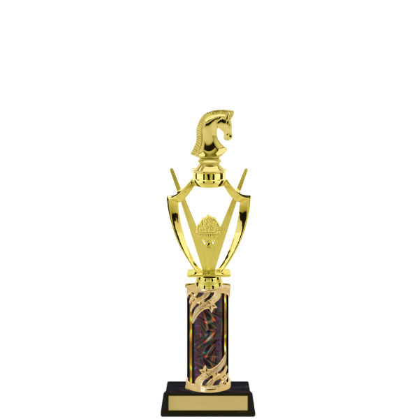 Stylish figure on accented riser, column & trophy base with gold accented stars wrapped around column.