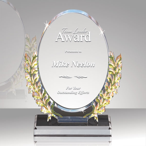 This clear oval acrylic award is available in three different color leafs gold, clear and green.