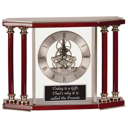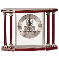Rosewood piano-finish mantle clock with 4 chrome accented pillars and a silver roman styled clock face.