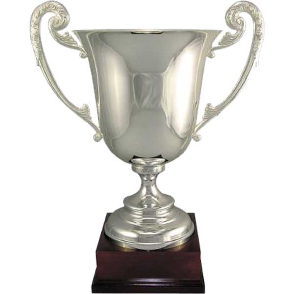 This high quality silver plated metal cup features a rosewood base and silver accent trim.