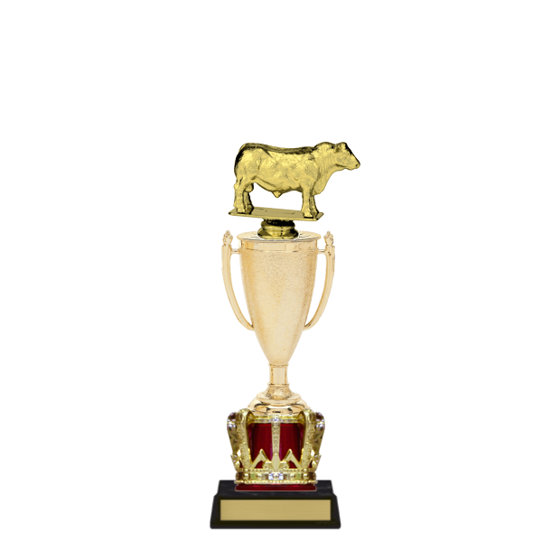 This elegant Crown Trophy features a loving cup, selectable figure and crown with red accent.