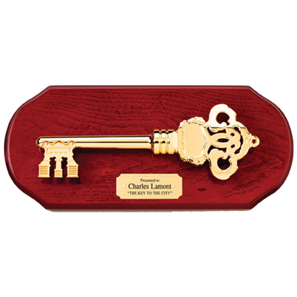 A mounted die cast gold key on a pianowood plaque. Presented to a distinguished guest on the steps of City Hall or honoring an important benefactor in the corporate world, this will serve as a lasting acknowledgement of their commitment.
