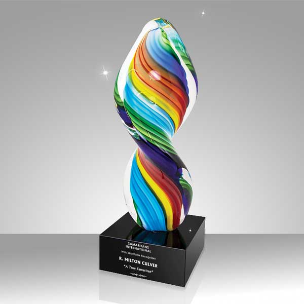 This art glass is an undeniable effect of enchantment caused by the appearance of a twisting rainbow. Make a powerful statement in any office or home.