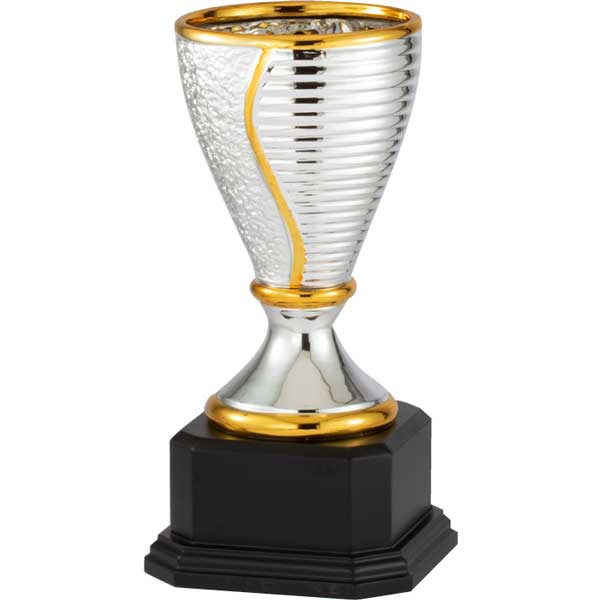 This Trophy Cup features a stylish gold and silver ceramic cup mounted on a wood base.