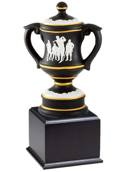 This ceramic trophy cup is hand-painted and features textured golfers on the face of the cup!