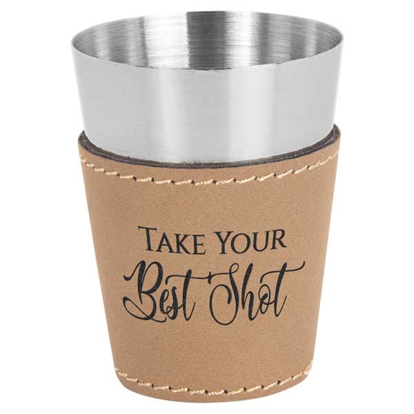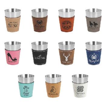 These 2oz leatherette shot glasses make a great gift idea and are great for large parties or ceremonies. Down the Hatch!!