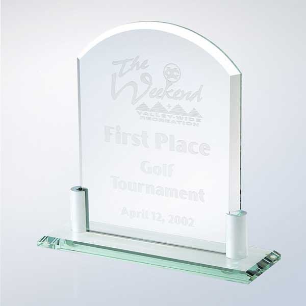 Jade glass award showcases a sweeping vertical beveled glass arch supported by two silver aluminum posts. Large engraving area for text, clip art and logo's.