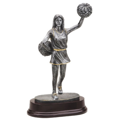 This wonderful cheerleading resin award features a silver and gold finish and a rose wood base.