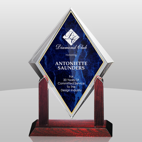 Classic and modern elements are utilized in the creation of this high quality acrylic award. The diamond sits gracefully in the beautiful complementary rose wood base.